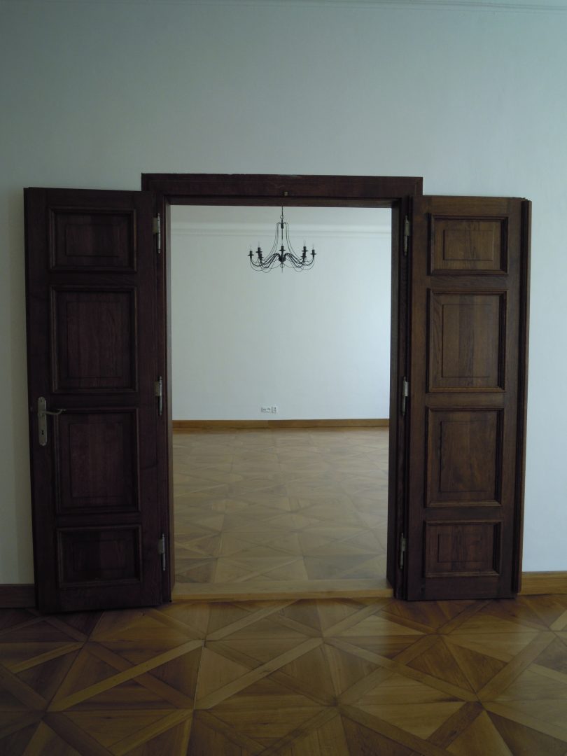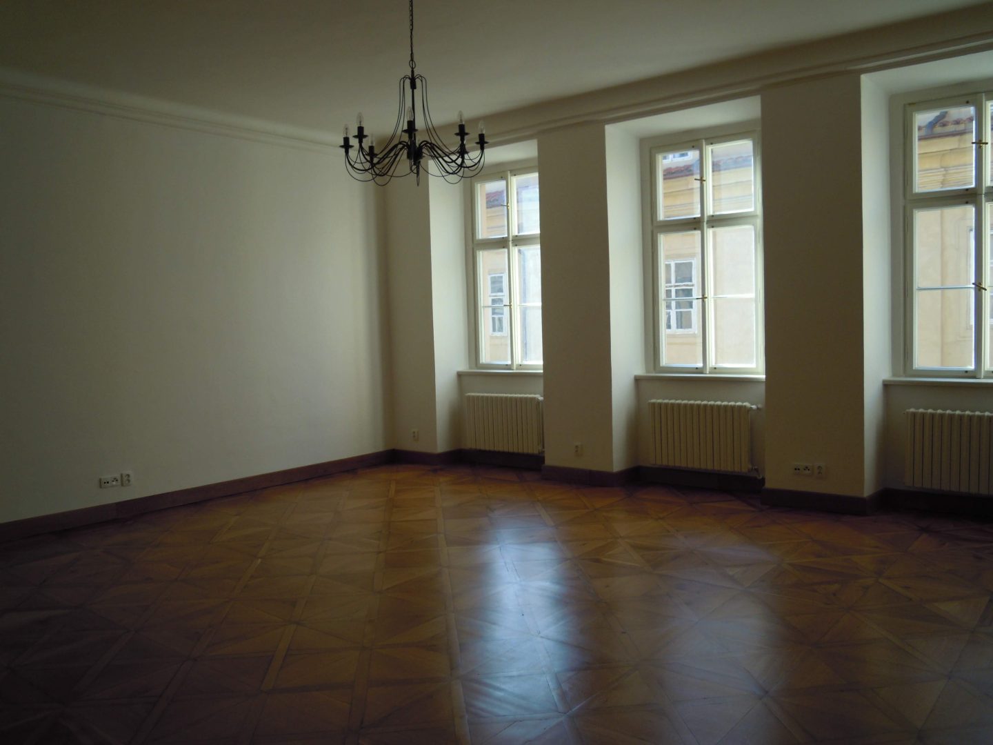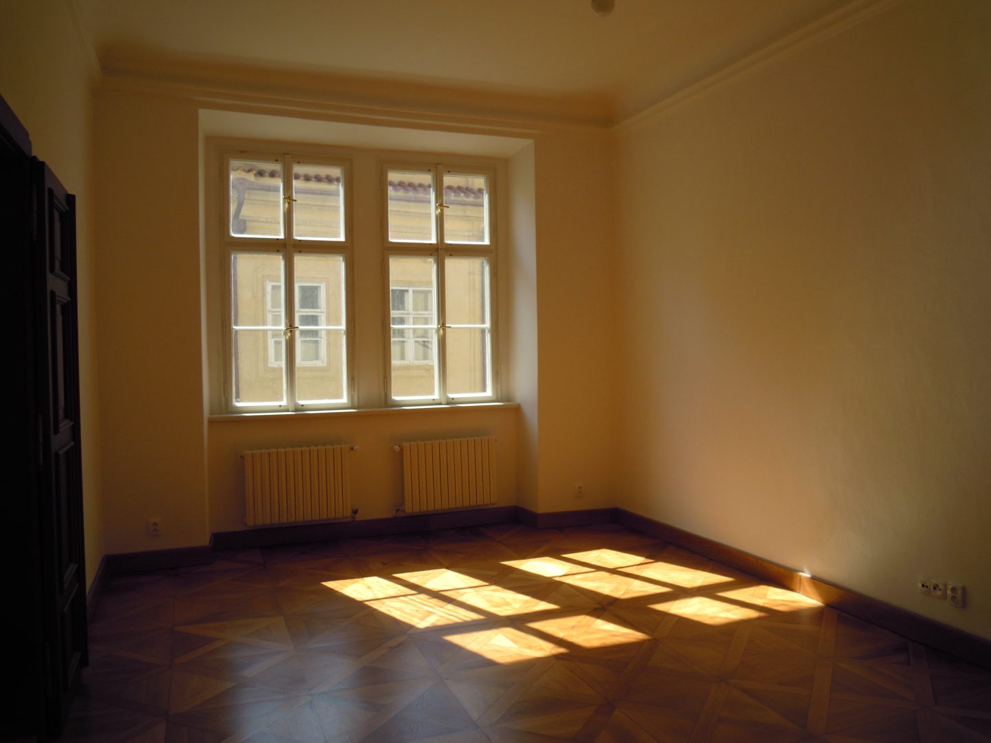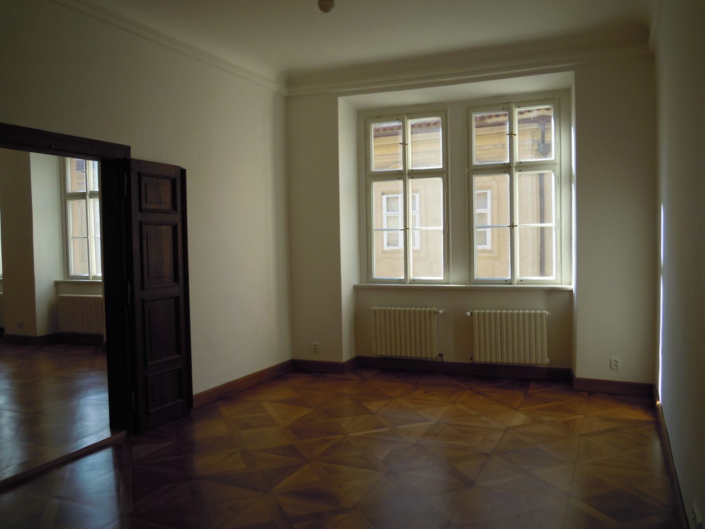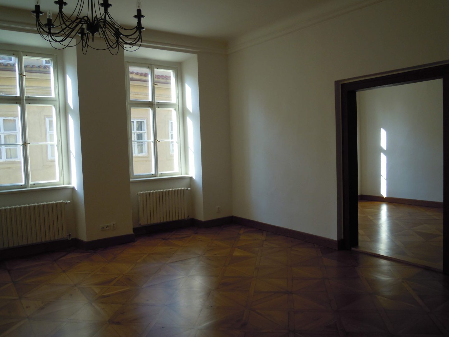 Spacious, bright apartment has two large rooms (44 m2, 27 m2) with historic cassette floors, overlooking the Neruda Street.