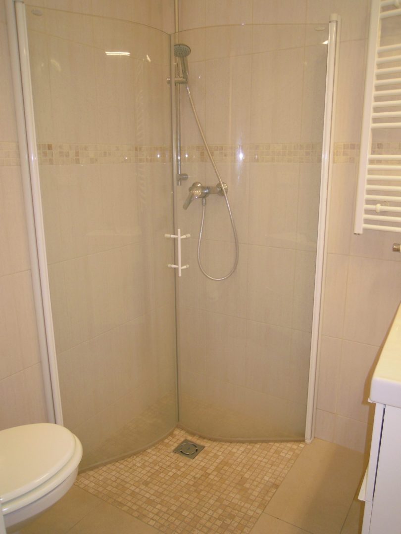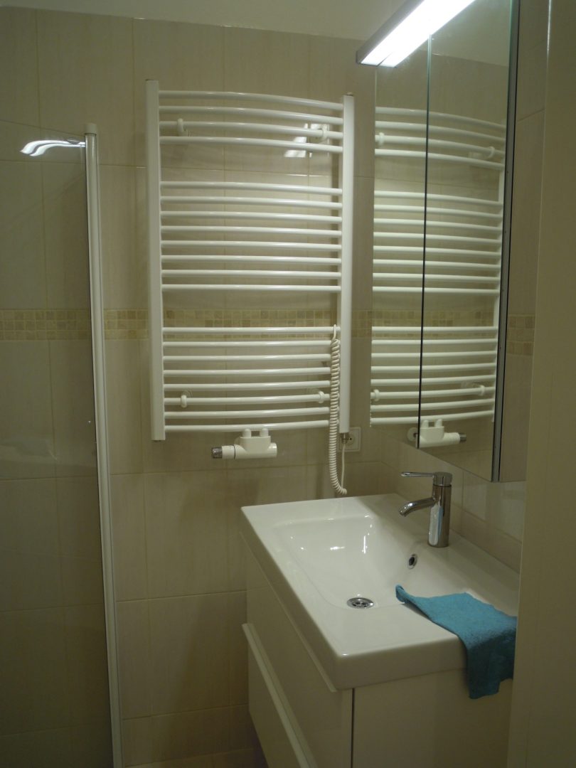 Two bathrooms: one with a bathtub and space for washing machine and toilet, the other with a shower and toilet. Both bathrooms and hall have floor-heating.